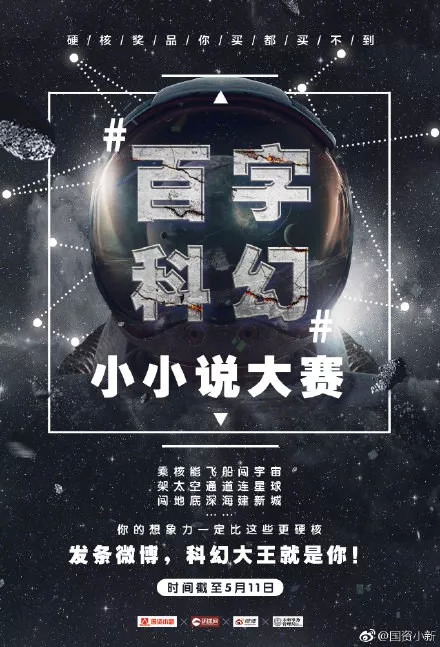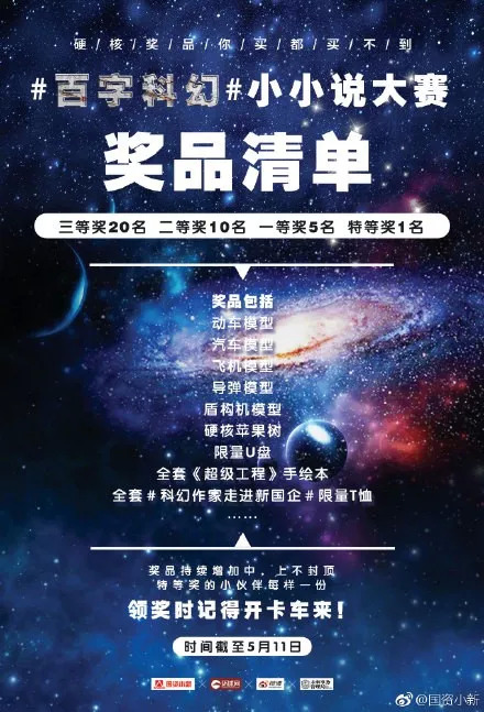 编发150字以内科幻小小说微博,并添加#百字科幻#和#科幻作家走进新国企#双标签即可!创作时间截至5月11日,随后邀请科幻作家和专家评审。三等奖20名,二等奖10名,一等奖5名,特等奖1名。奖品看大图!而且持续增加中,上不封顶,最重要的是——特等奖的小伙伴每样一份!领奖时记得开卡车来!!小新在微博等待你的脑洞~