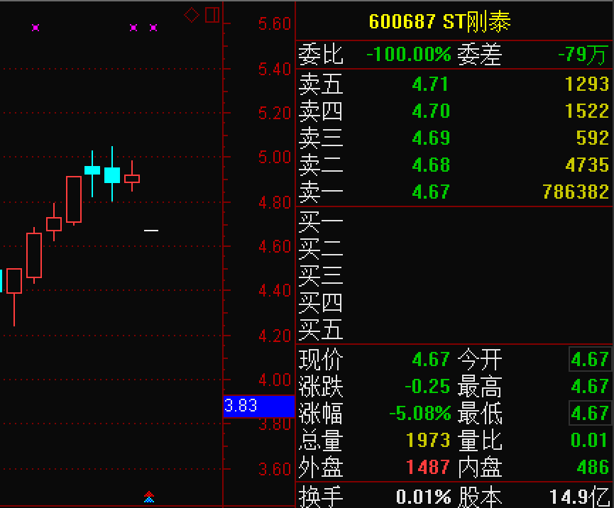 2019年4月12日,刚泰控股更名为ST刚泰(600687.SH)一事,刺激了市场敏感的神经,当天复牌后ST刚泰直接“一字跌停”,截至收盘时跌停板上还有78万手卖单排着队,妄图挤出拥挤的大门。