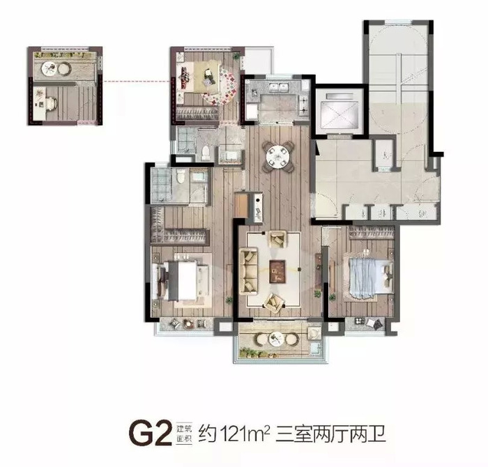 与售楼处同步公开的还有两个户型样板间,分别为99㎡(三房两厅一卫)和121㎡(三房两厅两卫)。精装交付标准也正式公开,两个户型内部配置相差不大。