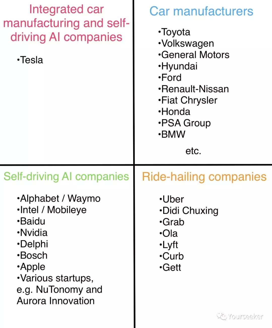 至于Mobileye、Uber、滴滴几家,目前来看,更多地选择了和传统汽车厂商达成合作,以期成为后者的软件及操作系统供应商。