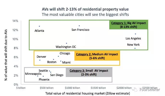 1万亿美元听起来是个很大的数字,但这主要是因为房地产市场本身就足够巨大。据美国最大的房地产在线广告商Zillow估计,美国住宅总价值超过29.6万亿美元。这意味着,由无人驾驶技术驱动的价值转移占总物业价值的2%至13%。