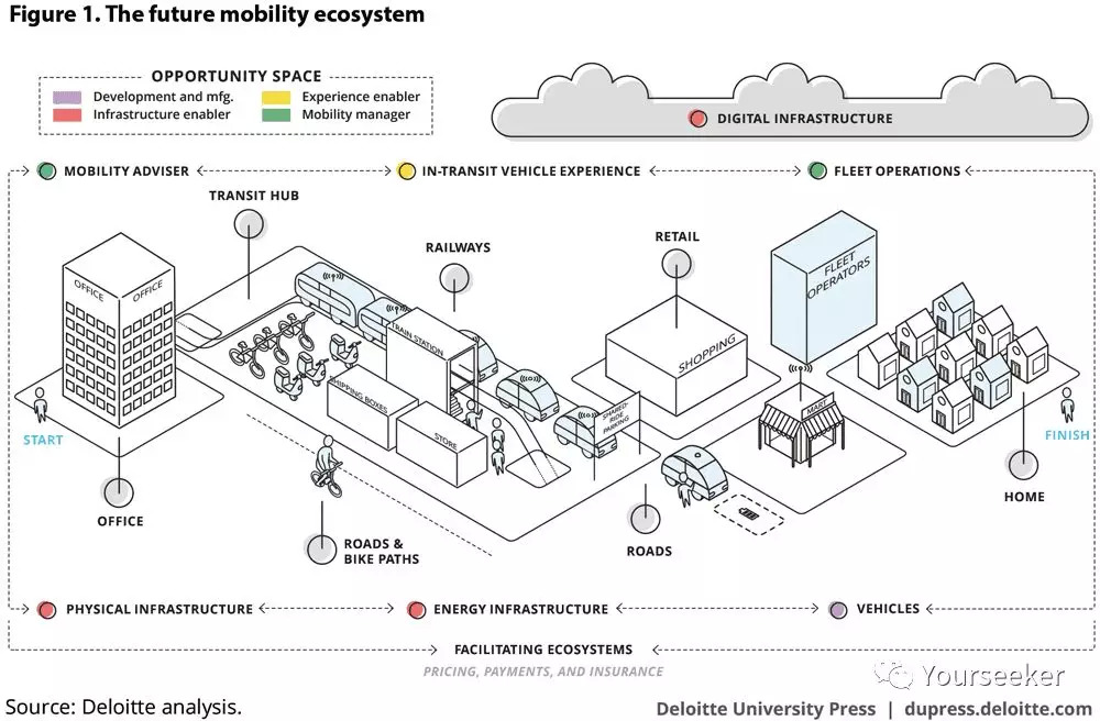 所以,未来的出行生态可能会是怎样?这个生态中又将孵化出哪些新型产品和服务?德勤在自己的一份研究报告中给出了解答。