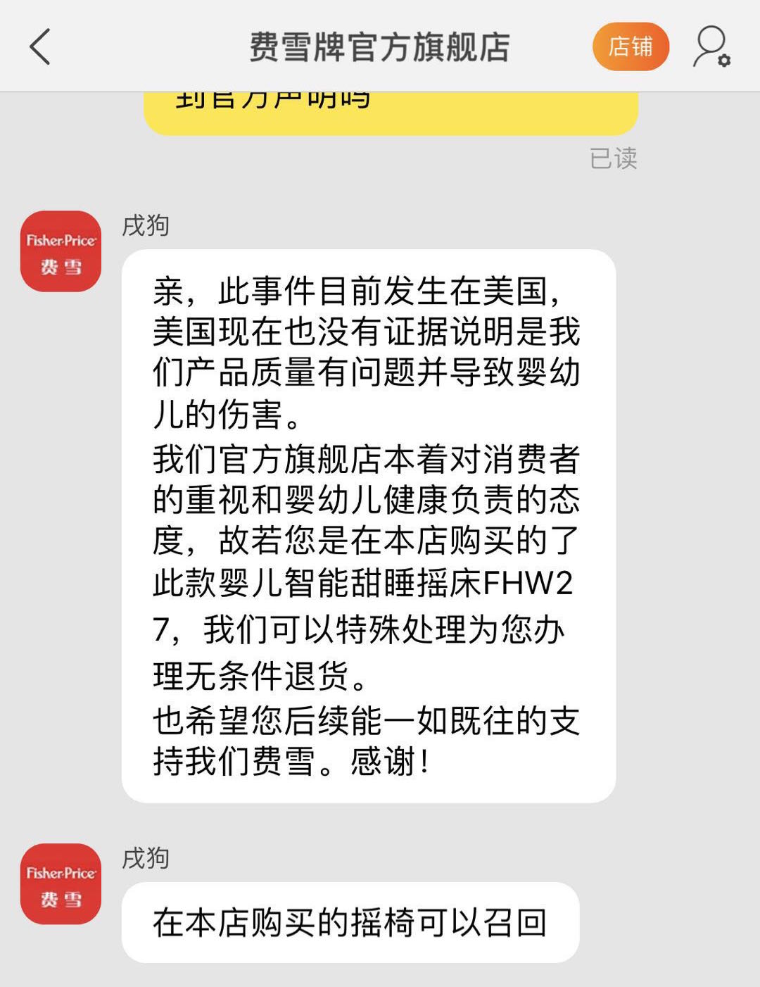 4月14日,界面新闻记者并未在天猫平台的“费雪牌官方旗舰店”搜索发现该产品,客服回应称,这款产品在早前已下架。当问及产品在中国市场的召回情况,客服表示如果有消费者在店内购买了此款“婴儿智能甜睡摇床FHW27”,可以特殊办理无条件退货。