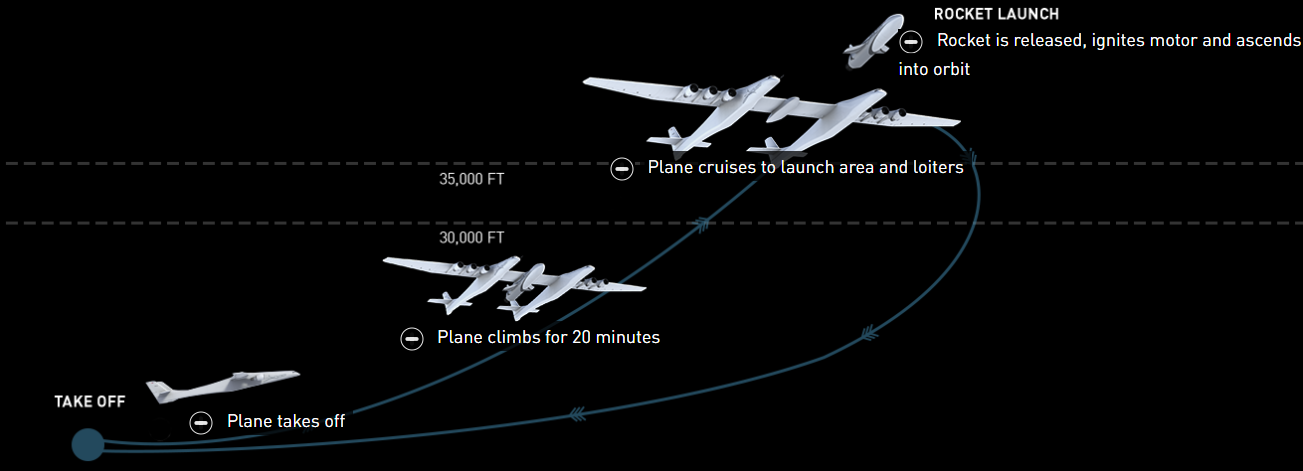 按照计划,Roc将携带小型火箭飞到约10.7千米的高空,再释放火箭,火箭在空中完成助推器点火,并将载荷送入轨道。借助成本更低的喷气燃料和可重复使用的运载飞机,这种发射方式将有效降低火箭进入太空的成本。
