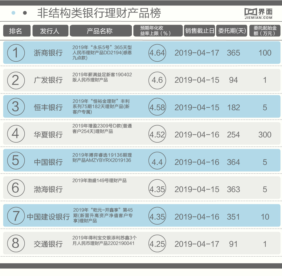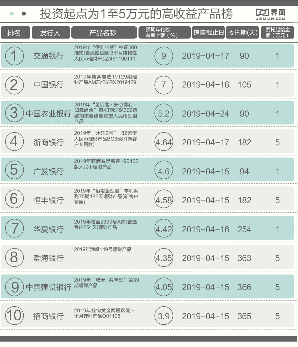 考虑到投资者的拟投资金额、风险偏好不同,本期还对起点为1至5万元的银行理财产品以及抛去结构化产品收益复杂设置、收益相对稳定的非结构类理财产品进行筛选,做成榜单,供投资者参考。