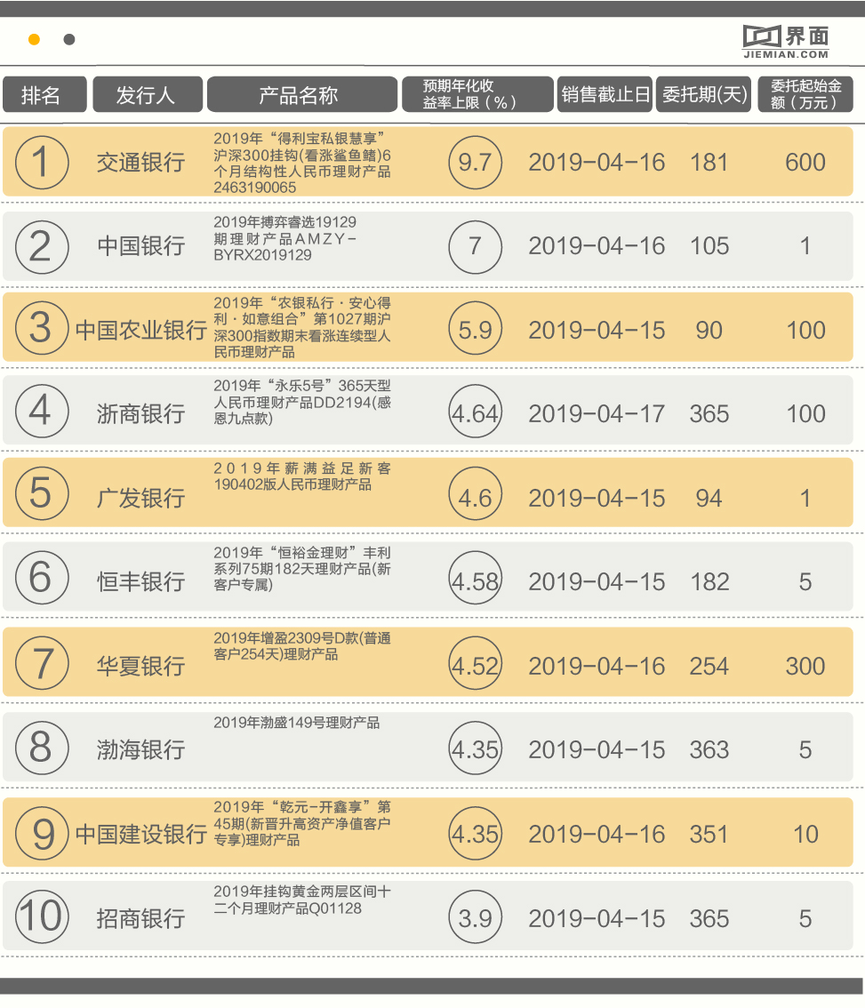 来看看本周有哪些可以挑选的银行理财产品,本周,18家国有商业银行和股份制商业银行全国范围发售针对个人的人民币理财产品139只,界面新闻从每家筛选了收益率最高、最值得关注的理财产品,共10只。