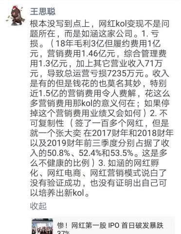 对网红经济颇有心得的资深网红王思聪同样不相信如涵的神话。上周,王思聪在朋友圈发言称,如涵的根本问题不是“网红KOL变现”,而是自身存在的三大问题:营销费用占比过高造成亏损;网红的不可复制性及过于依赖头部KOL;网红孵化、电商、营销模式没有验证成功,也没有证明自己可以培养出新KOL。