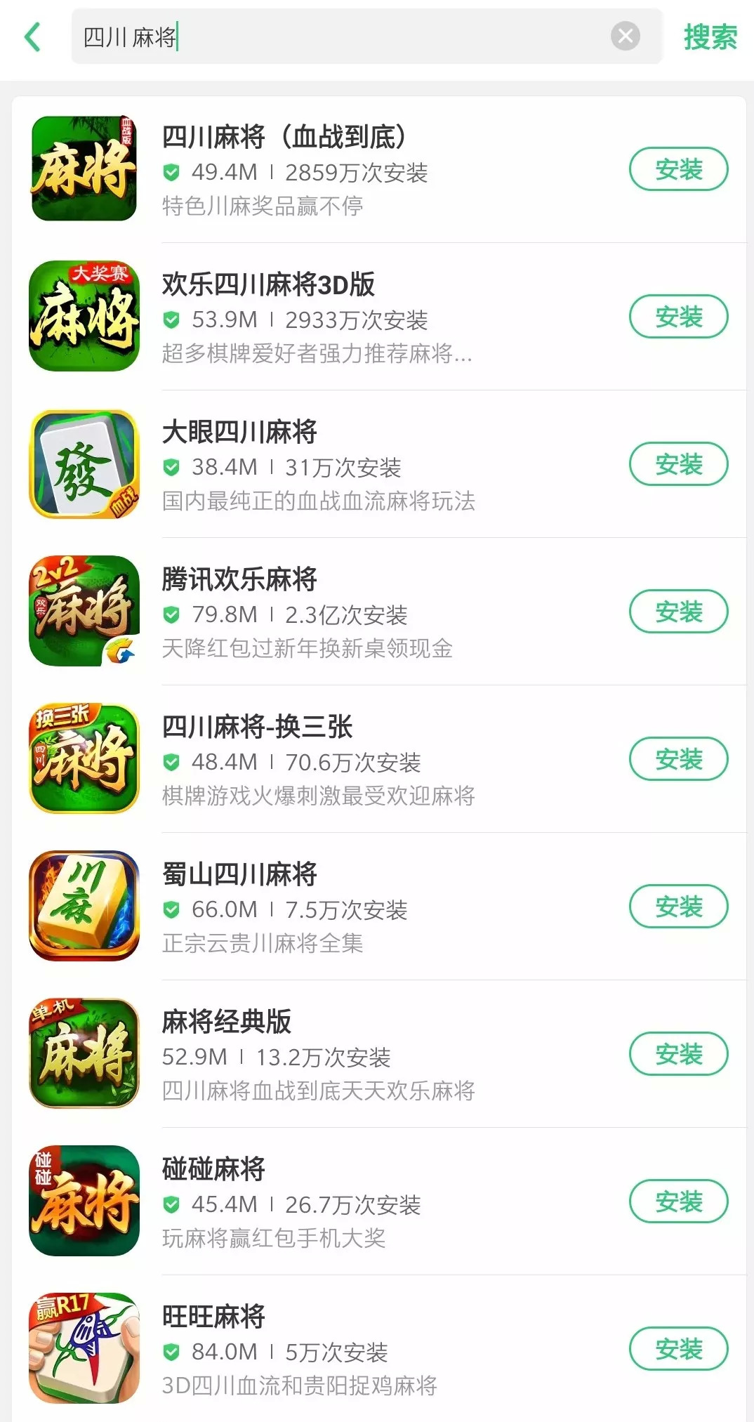 其结果,就是地方类棋牌游戏竞争格外激烈,尤其在四川等棋牌游戏氛围最浓厚的地方。即便到今天,在手机的应用商店中搜索“四川麻将”这一关键词,都能出现10款以上同类型的棋牌游戏,但这些游戏又都十分雷同,毫无特色。因此,如何动用本地的资源收获更多的用户,就是成功的关键。