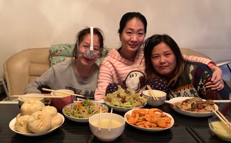 缓慢使她的活动范围通常局限于床上一隅。床上架着一张可移动的板,约2米长,桌上摆着她的笔记本电脑,也摆着一盘水果。晚饭时间,这里就成为一家人的餐桌。没有太多工作时,她一整天都平躺在床上,蓝色的被子搭在她的腿上,衬托着裸露在外的脚背上极细的血管。