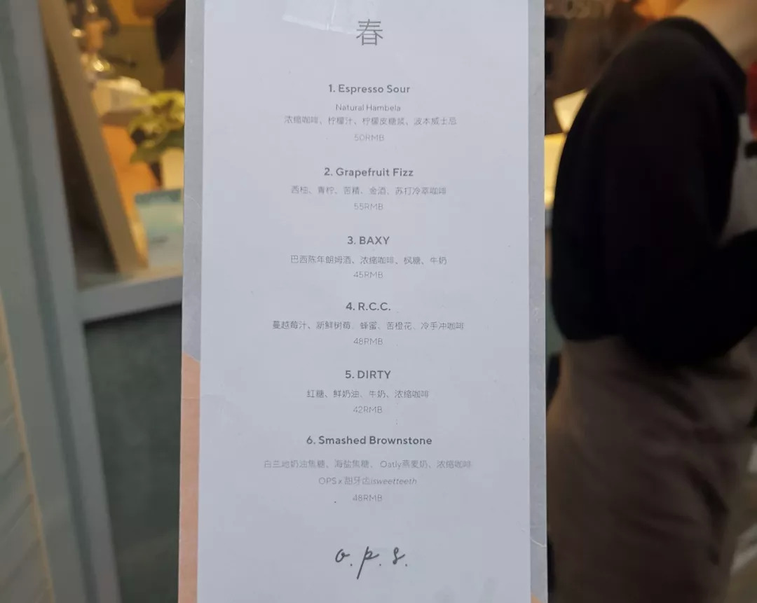 据同行的咖啡师介绍,OPS咖啡师阵容挺有来头——冠军、亚军咖啡师。产品主要以创意咖啡闻名,每个季节6款,每年24个新品。这样顾客点单的选择成本低,新鲜感始终存在,而且每季换新,会让老客有再来店的动力。