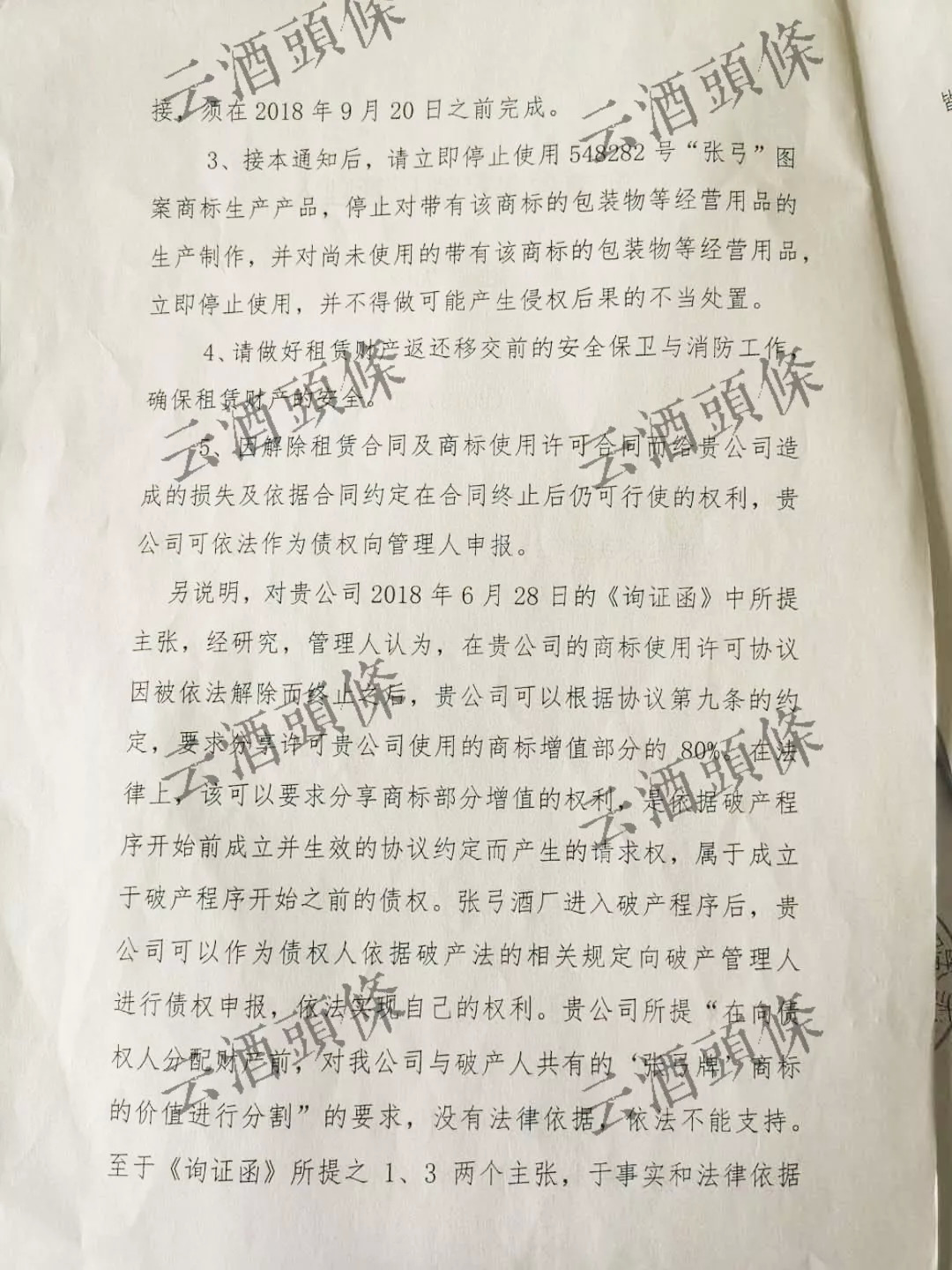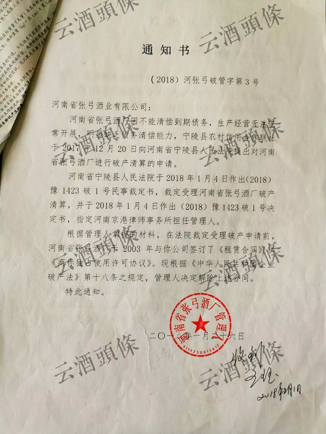 ▲2018年1月26日,张弓酒厂破产清算,张弓酒厂与张弓酒业签订的《租赁合同》、《商标独占使用许可协议》解除
