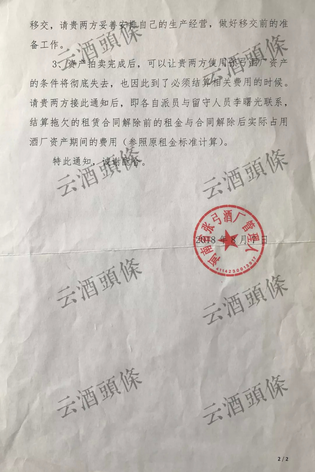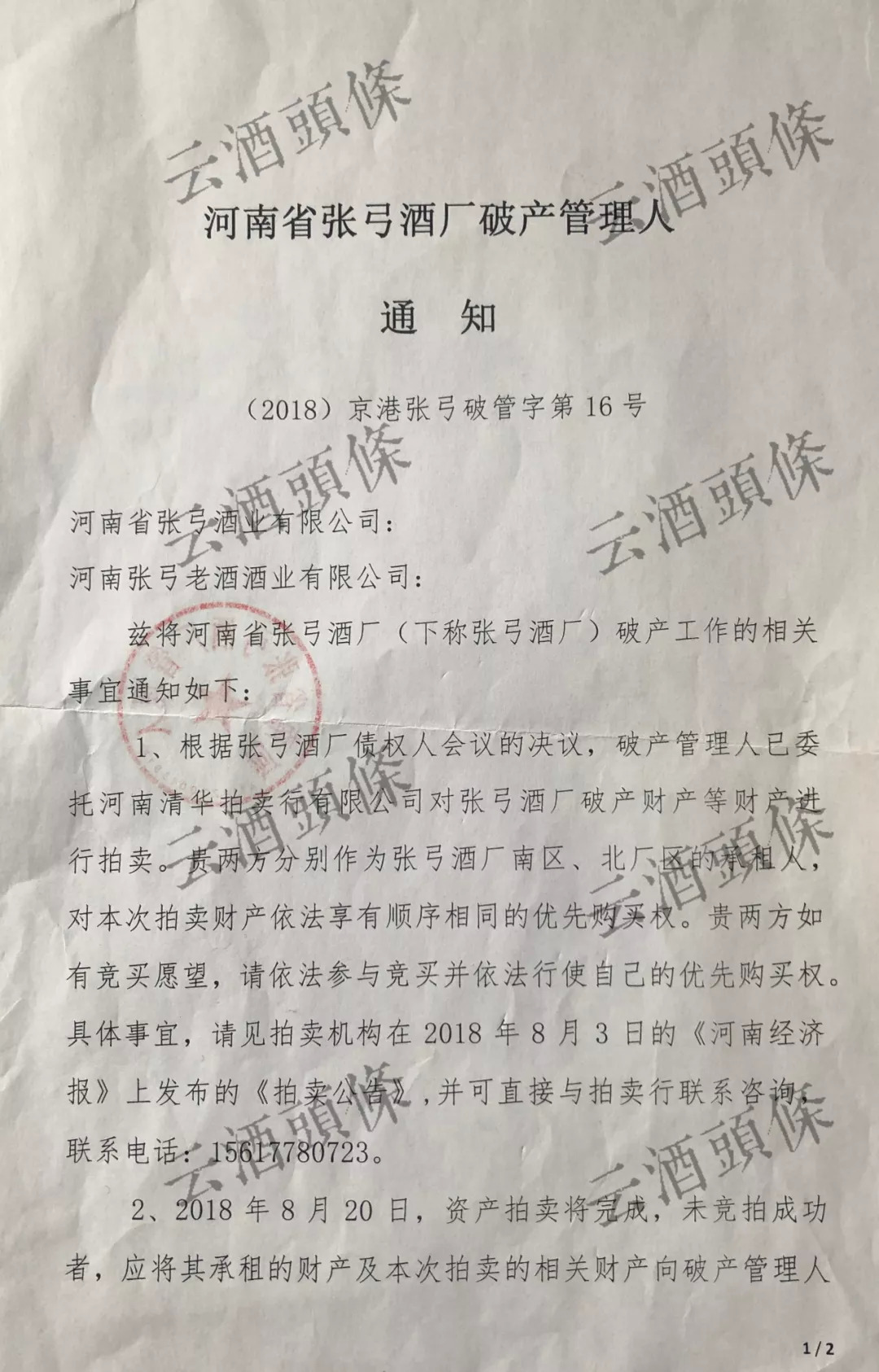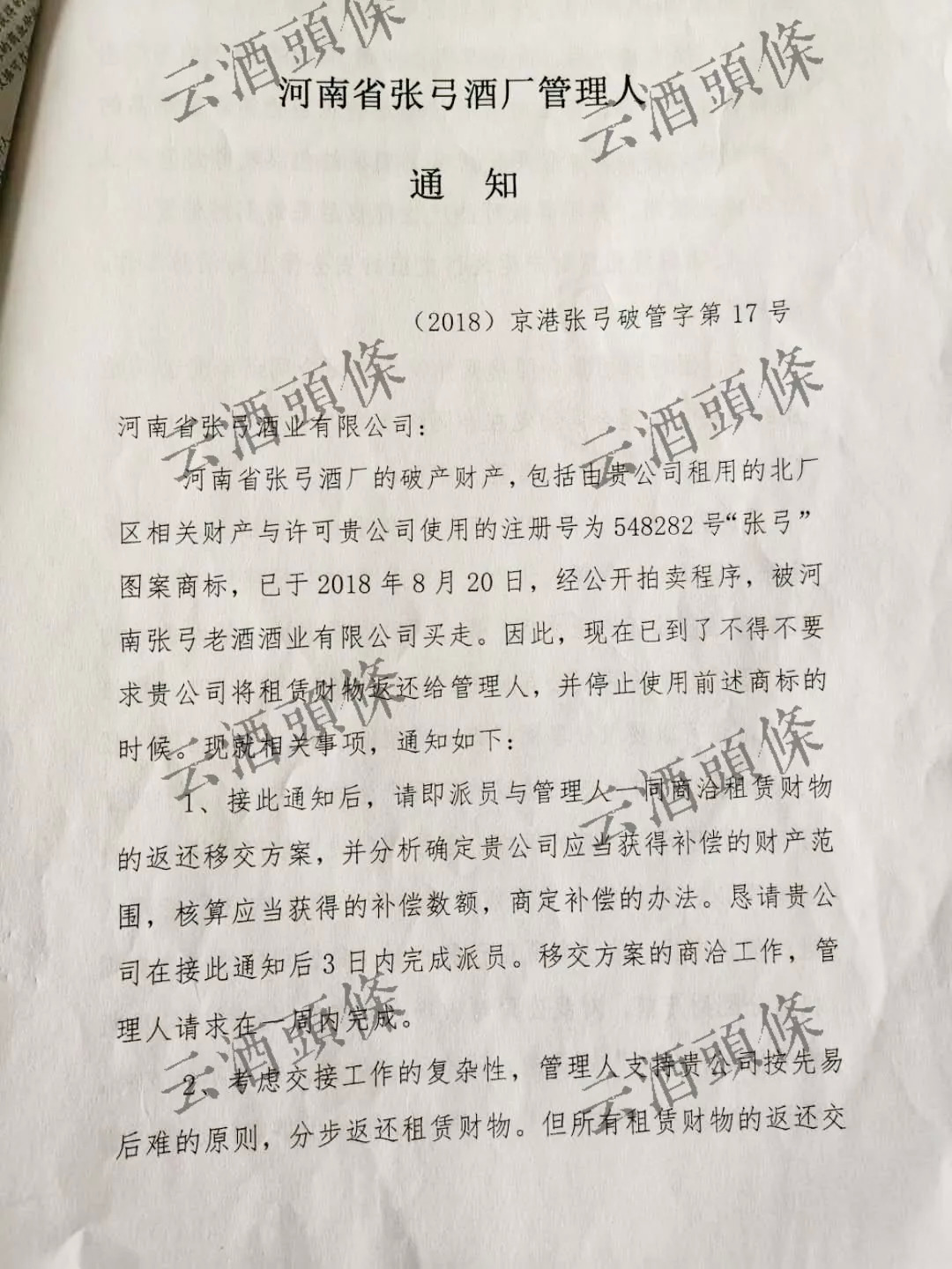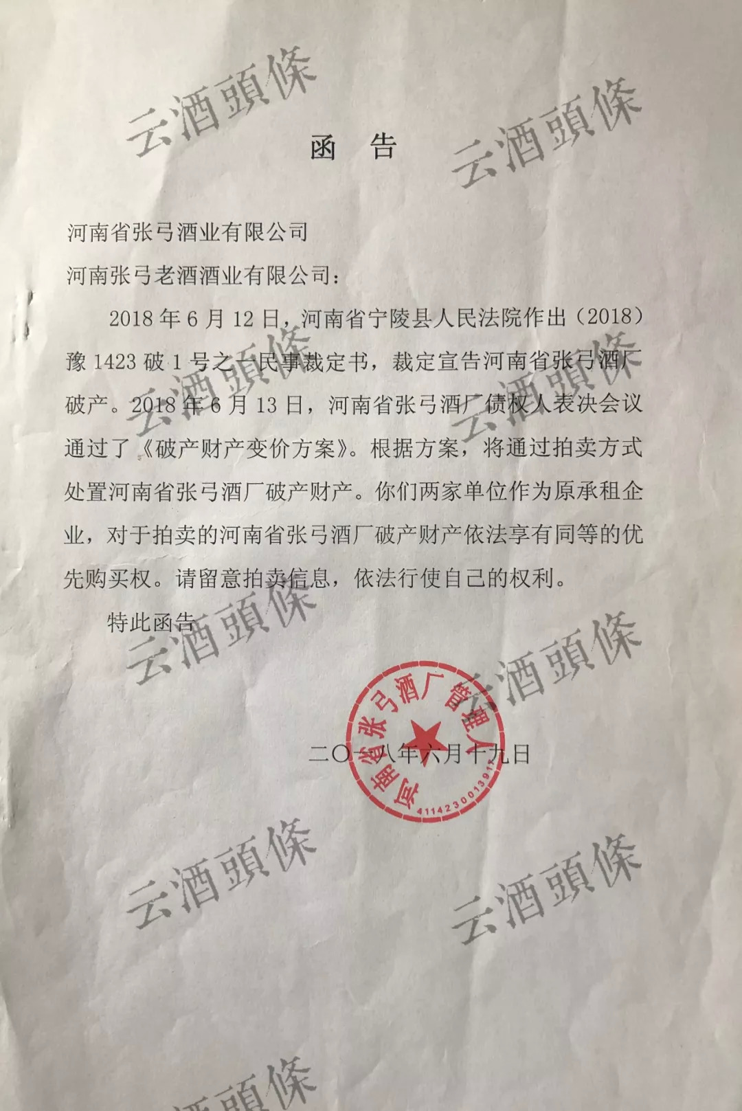 2018年6月12日,河南省人民法院作出裁定,宣告河南省张弓酒厂破产。次日,河南省张弓酒厂债权人表决会通过了《破产财产变价方案》,决议通过拍卖方式处置张弓酒厂破产资产。等到6月19日,一份函告便下发到张弓酒业及张弓老酒双方。作为原承租方,双方同时拥有优先购买权。