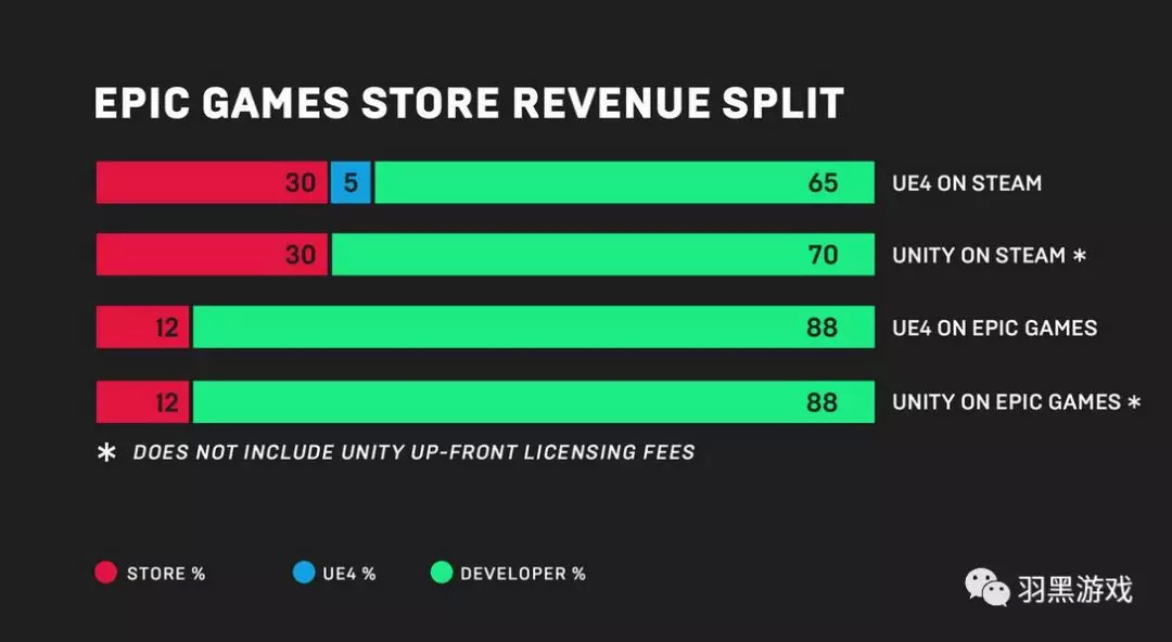 一般的游戏登录steam后要分出30%的收入交给Valve,其中销售额若超过1000万美元则可以减少到25%,突破5000万美元则可以减少至20%。但EGS上则是统一只抽取12%。