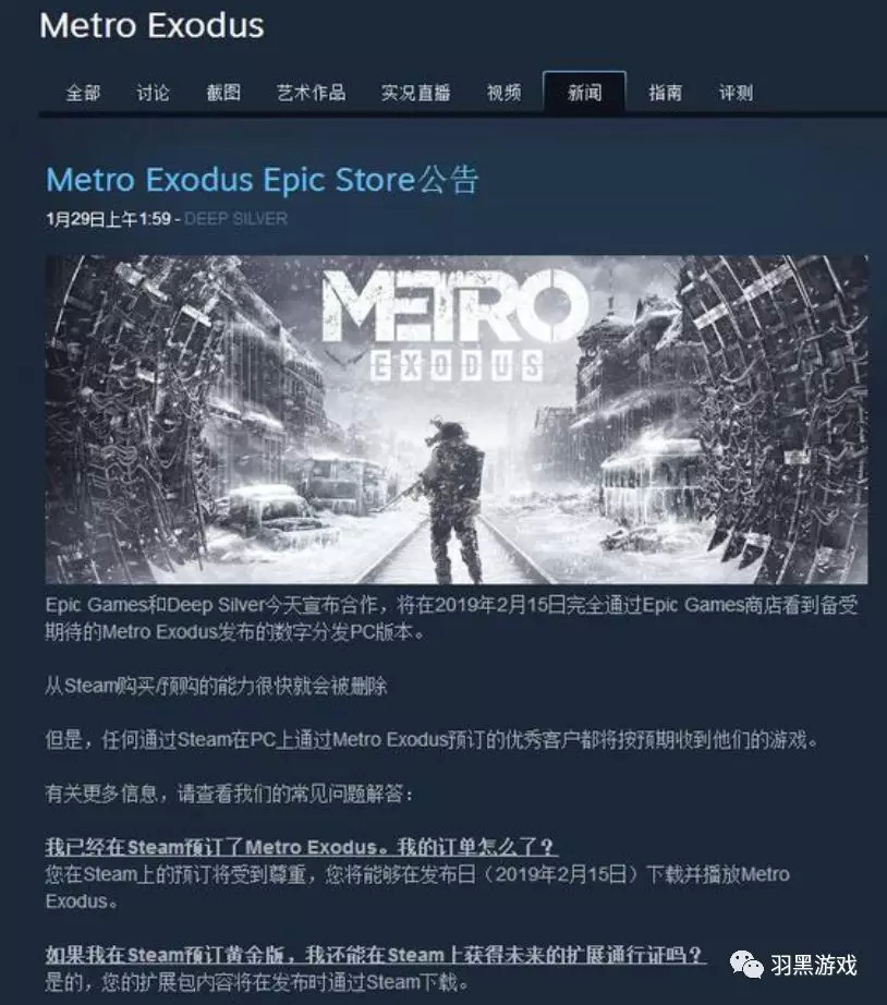 《地铁:离去》是2019年玩家十分期待的一部3A大作,本计划在2月15日登陆PC、PS4、XBOXONE的该作在发售前的半个月突然宣布,游戏将从steam商城下架,改为EGS独占一年。在steam预定了的玩家仍可以在发售日正常游玩,而实体版则只能选择退订。介于EGS在中国的锁区政策,这无疑对国内玩家造成了许多麻烦。