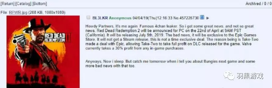 而在4月6日,国外论坛4chan爆料“R星的最新人气大作《荒野大嫖客2》将在今年登陆PC平台,并由EGS独占,更多情报会在4月22日公布”。因为是论坛匿名爆料,该消息的可行度存疑,但在当时仍然激起了不少讨论。