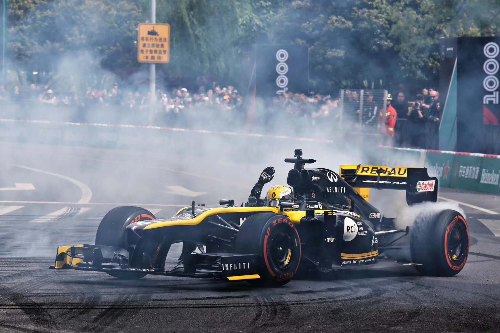 2019年4月13日,中国车手周冠宇驾驶雷诺赛车,在新天地进行路演表演。