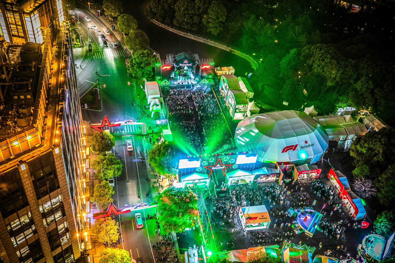 位于上海市中心新天地的F1嘉年华,由F1全球合作伙伴喜力携手打造,此次嘉年华,不仅有白天的路演。4月12日晚间,全球百大DJ之一的Martin Garrix到场表演,4月13日晚间则是李宇春、潘玮柏等人登台献声。