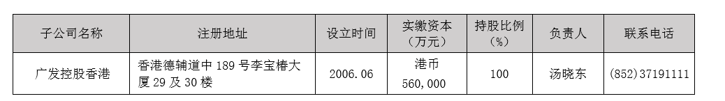 据年报披露信息,广发控股香港有限公司是广发证券于2006年在香港设立的100%全资控股子公司,也是香港首批获RQFII资格的中资金融机构之一。在广发控股香港旗下,设有广发融资香港、广发经纪香港、广发资管香港、广发全球资本和广发投资香港五家全资子公司。