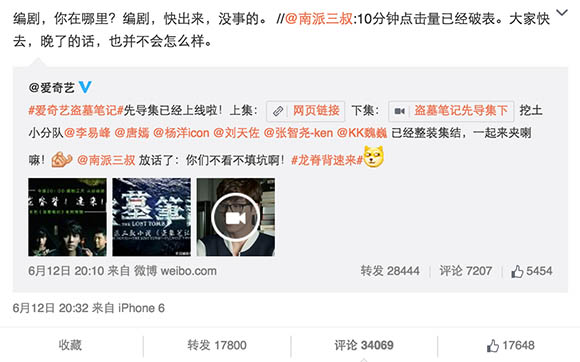 在南派三叔微博下面的34069条评论中,绝大部分都是对《盗墓笔记》网络剧先导集的吐槽,其中“把编剧交给国家”和“给编剧寄刀片”出现的频率相当之高。