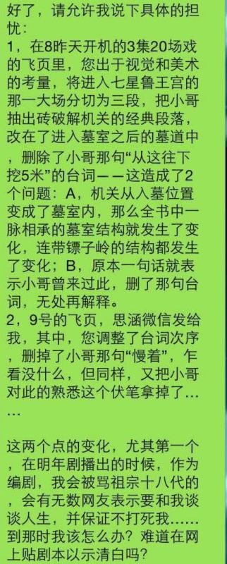 尽管被稻米和原著党吊打和炮轰,但编剧白一骢却显得很淡定,“(这两天)心情属于正常,因为盗笔的片子半年前我就看过了。”他半年前看过未加特技的粗剪,看完以后给当时有工作在身的另一位编剧彭阗打了个电话,留下四字箴言——赶紧搬家(不然会被原著粉砍死…)。
