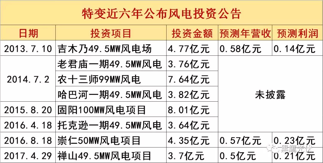 据黑鹰光伏团队统计,在2013年-2017年这五年间,特变发布了6分左右风电项目投资公告,装机容量合计为546.5MW,投资总额约为43.53亿元;而仅2018年特变所公布的投资风电装机容量就达到1125MW,投资总额高达87.47亿元。其明显加快了风力发电领域的投资步伐。