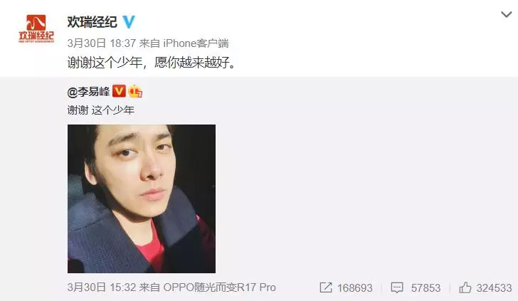 在半个月前的3月30日,李易峰发微博“谢谢这个少年”,并配了自拍照。傍晚,欢瑞世纪副总裁姜磊发文:“感恩人生,曾经相遇这个少年!江湖不远,自在相逢!”随后,欢瑞经纪也写道:“谢谢这个少年,愿你越来越好。”