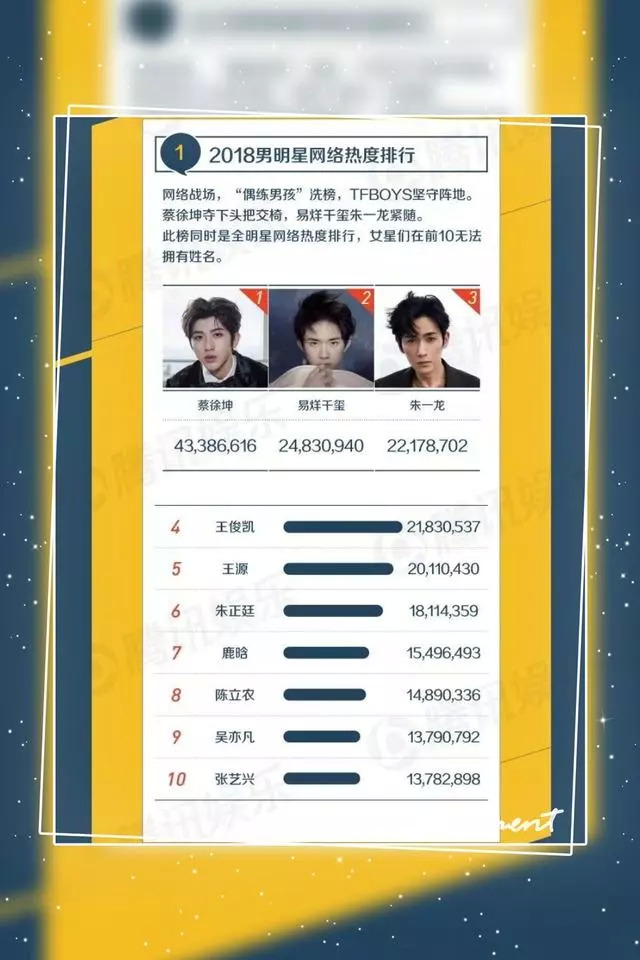 而且,小鲜肉的天下也是瞬息万变,新流量艺人迭代速度明显在加快,近两年的娱乐圈中出现了大批95后的小鲜肉,比如蔡徐坤、刘昊然、易烊千玺、王源、王俊凯等等,其中蔡徐坤更是仅用6个月的时间,就将鹿晗和TFBOYS的三人超越,登顶2018年男明星网络热度排行榜首。