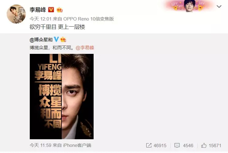4月15日中午,博众星和更新一条微博“博览众星,和而不同”并@李易峰,紧接着李易峰转发此条微博,并配文“欲穷千里目,更上一层楼”,疑似官宣自己已经加盟新经纪公司博众星和。