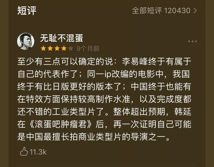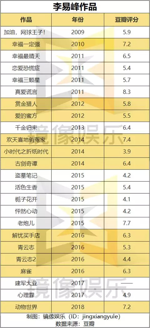2018年,李易峰更是仅《动物世界》一部作品问世,《动物世界》在豆瓣7.2的分数,已经是他主演的电影里排第二的口碑成绩。与《心理罪》相比,《动物世界》上映后,影片上映后观众对李易峰的演技有了更直观的肯定,就像《动物世界》的豆瓣短评说的一样:“李易峰终于有属于自己的代表作了。”
