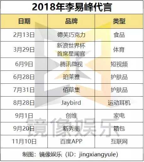 首先代言方面,据不完全统计,李易峰在2018年新接代言9个,包括短视频、护肤品、互联网等各个领域。