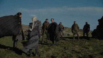 就这样,雪诺、大熊乔拉、二锤詹德利等组成敢死队誓要到长城北以去捉鬼。乔拉与龙妈的告别被人调侃为“帅逼一集床上走,备胎七季摸个手”。