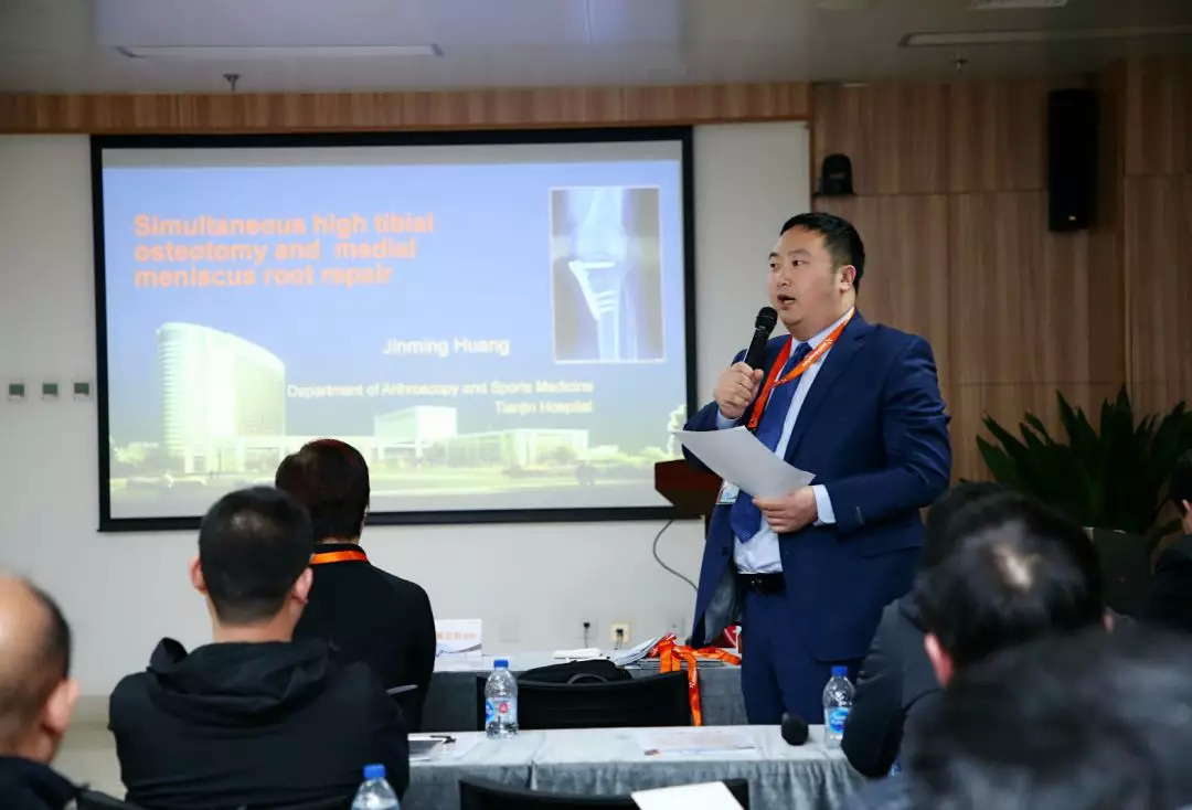 下午的活动主要是学术报告和病例讨论。首先由黄竞敏教授做了题为“内侧半月板后根部撕裂,如何应对?”的学术报告。Bancha教授做了题为“根部损伤外侧vs内侧”、“膝关节多韧带损伤修复”的报告。河北省第三院董江涛教授和河北沧州市中心医院刘畅教授分别做了题为“移植物与固定方式组合”和“局麻非止血带下经后膝经膈入路的临床应用”。学术报告会结束后进入病例讨论环节。我院运动损伤与关节镜二病区赵谦医生、任富继医生分别就多韧带损伤,前交叉韧带断裂合并力线不良的特殊病例展开讨论,参会的各位精英及专家各抒己见,现场交流气氛活跃