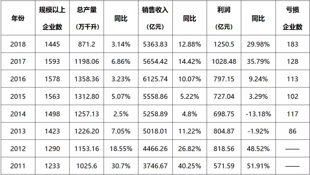 如果纵向比较却可以发现2018年似乎又是一次“增长式下降”:规模以上企业数量下降148家、总产量下降326.86万千升、总销售收入下降290.59亿元,同时亏损企业增加55家至183家,亏损面达到了12.66%,创近6年来最高水平。
