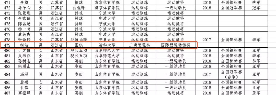 一个月前,据央视网微博报道,围棋世界冠军柯洁将免试进入清华大学,就读工商管理类专业。国家体育总局官网公示了《2019年优秀运动员免试入学推荐名单》,柯洁名列榜上。他本人的运动等级为国际级运动健将。早在2015年6月,他就被体育总局授予了这一称号。