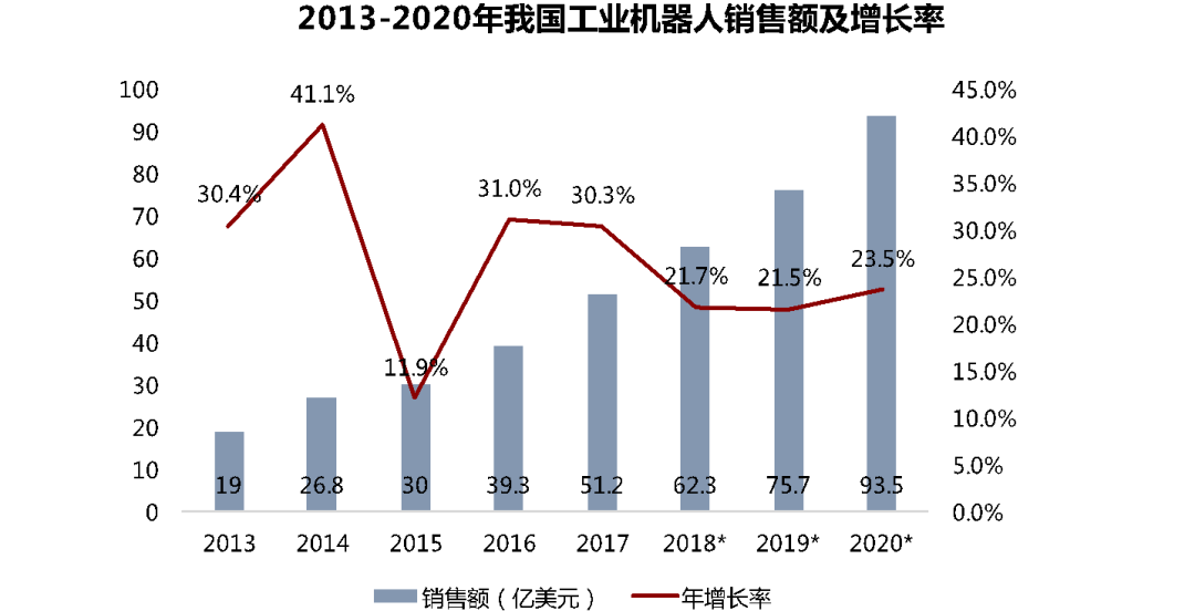 中国工业机器人市场规模持续增长,关节型搬运机器人占比较高:我国是全球第一大工业机器人应用市场,约占全球市场份额三分之一。近年来我国工业机器人市场发展较快, 年均增长超过20%,2017 年我国工业机器人销量达 13.8 万台,销售额达到51.2亿美元,预计到 2020 年国内市场规模将进一步扩大到93.5 亿美元。