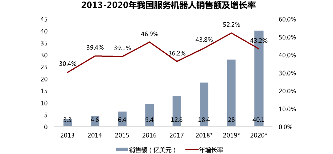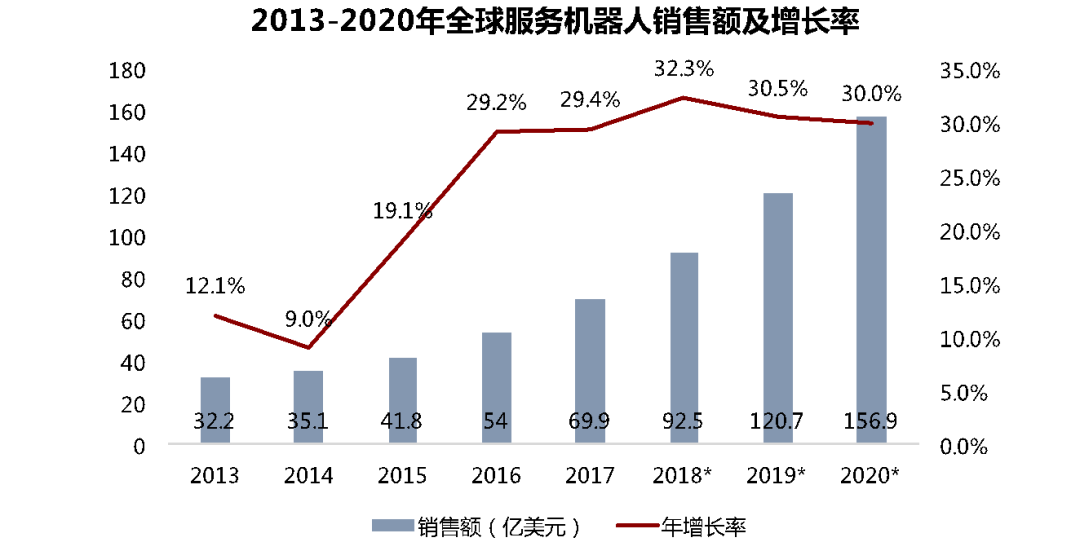 随着新一代人工智能兴起,全球服务机器人行业迎来快速发展:2013 年以来全球服务机器人市场规模年均增速达23.5%,2018 年全球服务机器人市场规模将达到 92.5 亿美元,2020 年将快速增长至 156.9 亿美元。