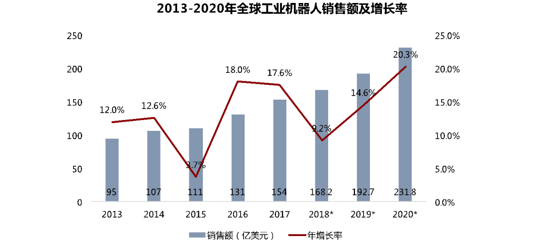 全球工业机器人销量稳步增长,亚洲市场依然最具潜力:2013 年以来,工业机器人的市场规模以年均 12.1%的速度增长。2017 年全球工业机器人销售额达到 154 亿美元,其中亚洲销售额 99.2 亿美元,欧洲销售额 29.3 亿美元,北美地区销售额 19.8 亿美元。