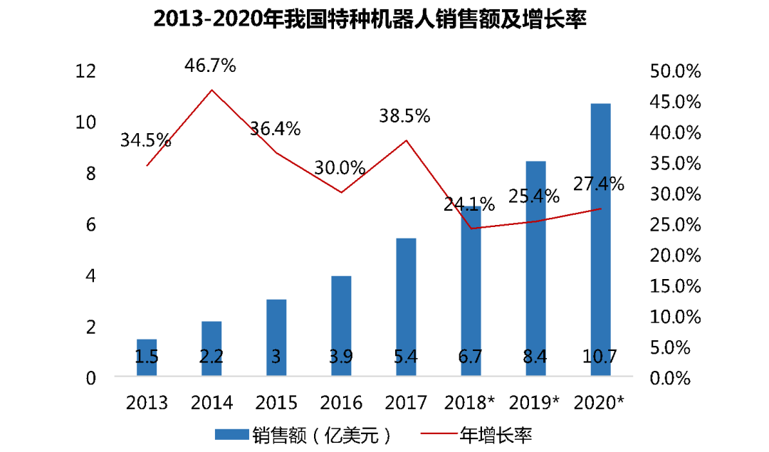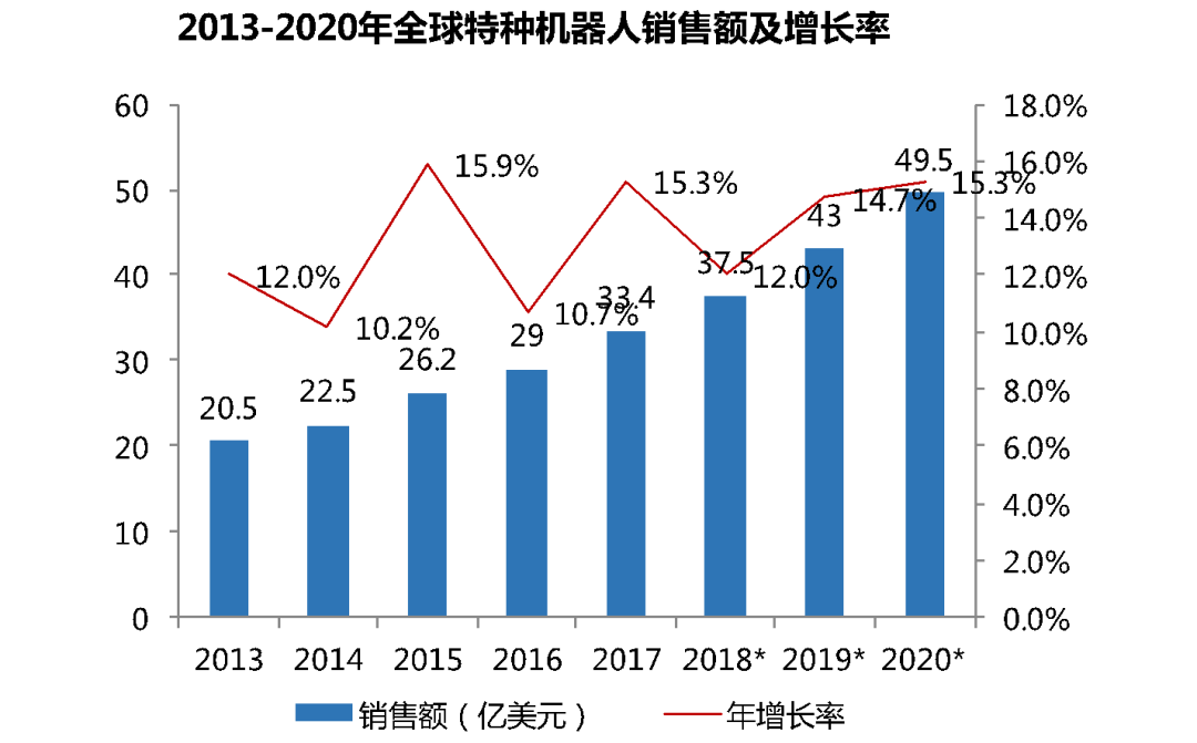 全球特种机器人新兴应用持续涌现,各国政府相继展开战略布局。2013 年以来全球特种机器人产业规模年均增速达 12.8%,2018 年全球特种机器人市场规模将达到 37.5 亿美元;至 2020 年,预计全球特种机器人市场规模将达 49.5 亿美元。美国、日本和欧盟在特种机器人创新和市场推广方面全球领先。