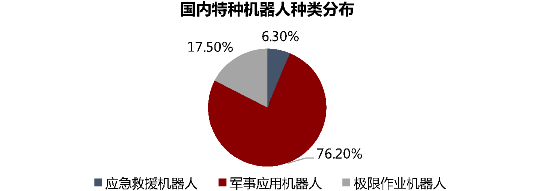 随着技术的不断提升,智能性与适应性显著增强,特种机器人应用场景迅速增加;中国特种机器人部分关键核心技术取得突破,无人机、水下机器人等领域形成规模化产品。我国特种机器人76.2%为军事应用机器人,机器人企业及研究院所不断加大对特种机器人的研发力度,并以无人机、水下机器人、防爆巡检机器人等为切入点,研制出一批掌握自主知识产权新型产品。