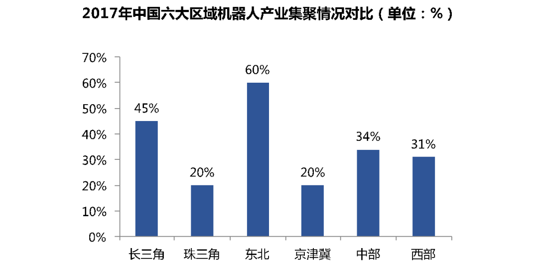 从产业集聚度看,东北地区产业聚集程度位列全国之首。由于本地龙头企业占据了东北地区机器人市场产销量的绝大多数份额,产业集中度达到60%;得益于众多全球机器人领军企业及国内龙头品牌在长三角地区设有总部基地或研发中心,产业集中度达到45%;由于存在大量的机器人本体设计制造与系统集成初创公司与小型民营企业,京津冀和珠三角地区机器人产业集聚度整体偏低为20%。