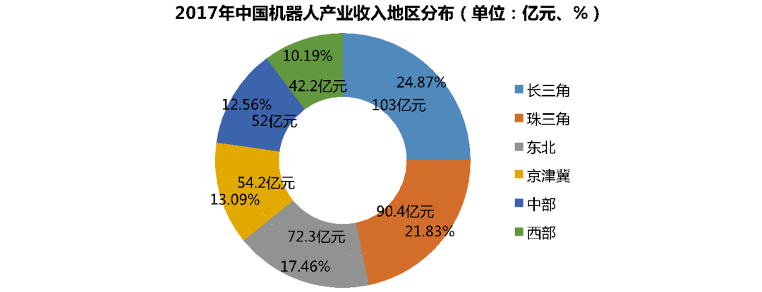 从产业布局看,全国呈现京津冀、长三角、珠三角、东北、中部和西部共六大集中发展区域。在我国机器人产业发展中,长三角地区基础相对最为雄厚,珠三角地区、京津冀地区机器人产业逐步发展壮大,东北地区虽具有一定机器人产业先发优势,但产业整体表现较为有限,中部地区和西部地区机器人产业发展基础较为薄弱,但已表现出相当的后发潜力。