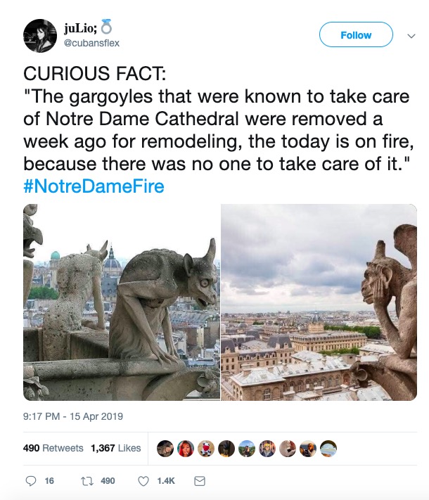有网友在推特上提到,一周前守护圣母院的“神兽”被移出进行修复,导致失去了“守护者”的圣母院发生大火。