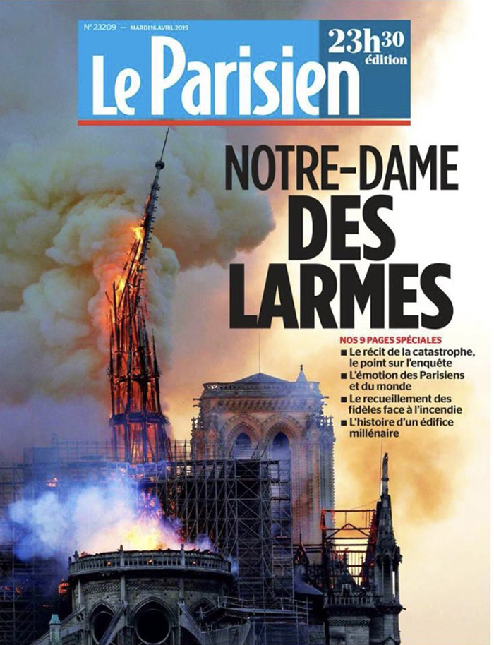 “心已成灰(Le coeur en cendres)”、“圣母在哭泣(Notre-Dame des Larmes)”、“我们的悲剧(NOTRE DRAME,与巴黎圣母院NOTRE DAME仅差一字)”等字眼与这颗“巴黎心脏”的燃烧景象席卷了全法报刊封面。