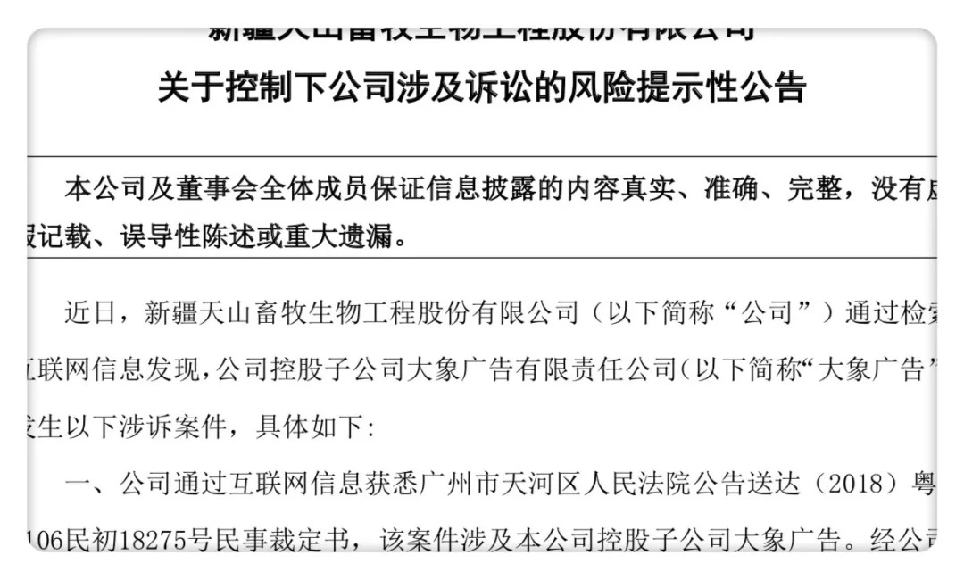 天山生物与原股东争夺大象广告控制权的“大戏”再生枝节。4月13日,天山生物发布公告,接到新疆昌吉回族自治州中级人民法院传票。