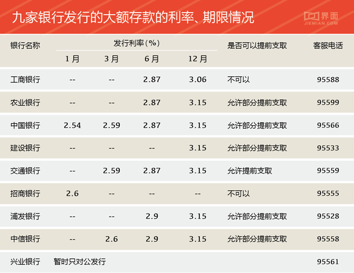 截至目前,共有9家大型商业银行宣布发行大额存款。那么这9家银行发行的大额存款的利率、期限等分别如何呢?