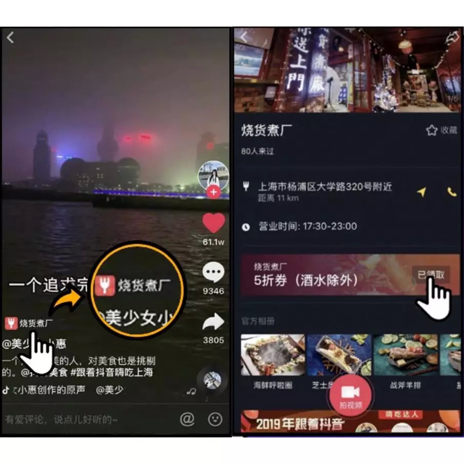 POI作为抖音“美好生活”的服务载体,旨在助力本地化生活服务商家,借助内容+POI相关功能组件,将抖音线上精准的巨大流量引导至线下转化为客流。借助抖音在内容上的“顶层设计”,消费+打卡将促使内容回流至线上,完成前文所述的“破壁三部曲”。以#跟着抖音嗨吃上海#这个活动为例,用户因为短视频的内容被激发“兴趣点”,通过点击“POI”图标进入抖店主页,最后完成领券去线下拍短视频打卡的动作。