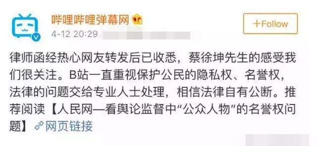 二次元人群聚居的B站强势回应,并附上人民网的一篇名为《看舆论监督中“公众人物”的名誉权问题》,暗指B站没有侵犯侵犯蔡徐坤的名誉权。