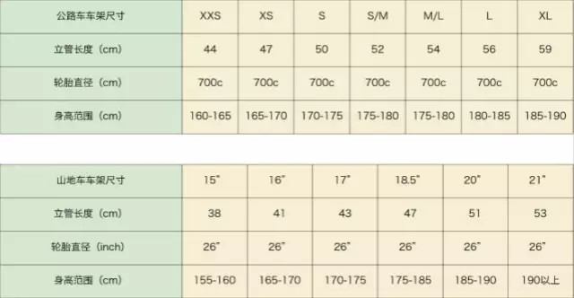 车行或是网店对于车辆尺寸一般会给出两种标记方式。一种是和衣服一样,给出从XXS到XL的码号——相对应的立管长度则是从44cm到59cm,而通过立管长度又可以得到适合的身高范围。另一种是对立管标注英寸值,从14.5英寸到21英寸,也可以得到一一对应的适用身高范围。