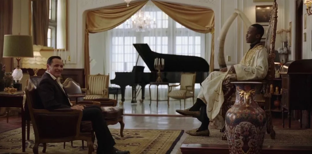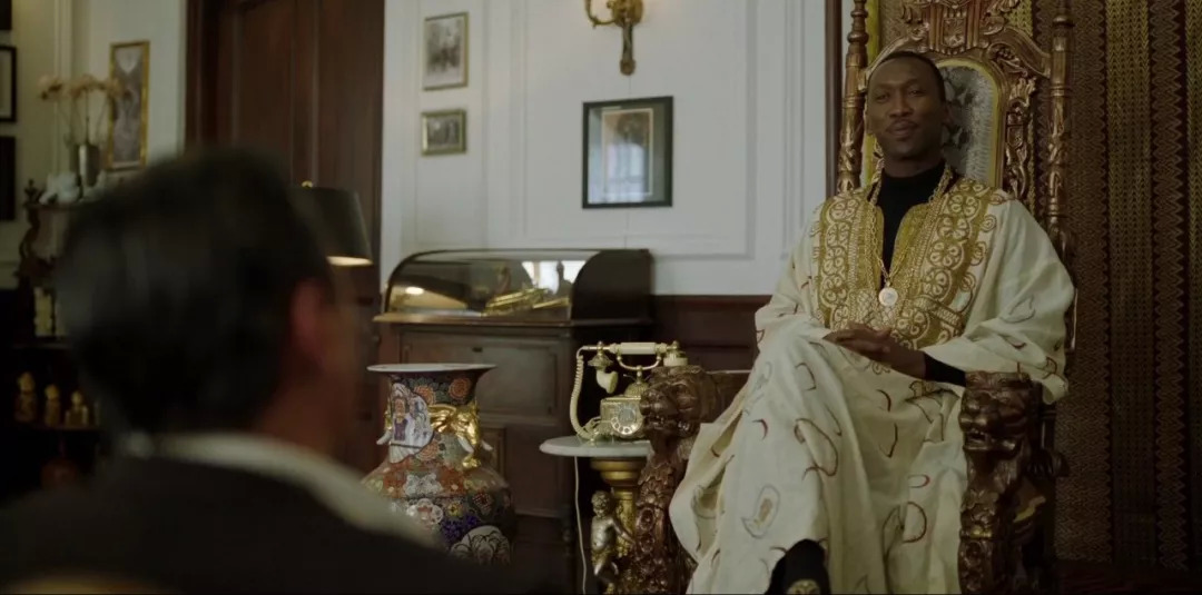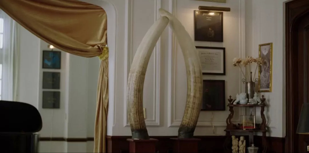 会客区本来应该是一体的,在唐家却出现了明显的分化。唐的主位摆放着非洲标志性装饰,非洲象牙;旁边的花瓶、椅子,都有黄金雕刻的非洲装饰。