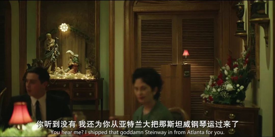 ▲餐厅正中间也摆着大型圣母塑像,还给了多个角度的特写,暗示他们传统的阶级思想。酒店经理愿意花大价钱专门从亚特兰大运一台专用的钢琴,也不愿意让唐进入餐厅用餐。